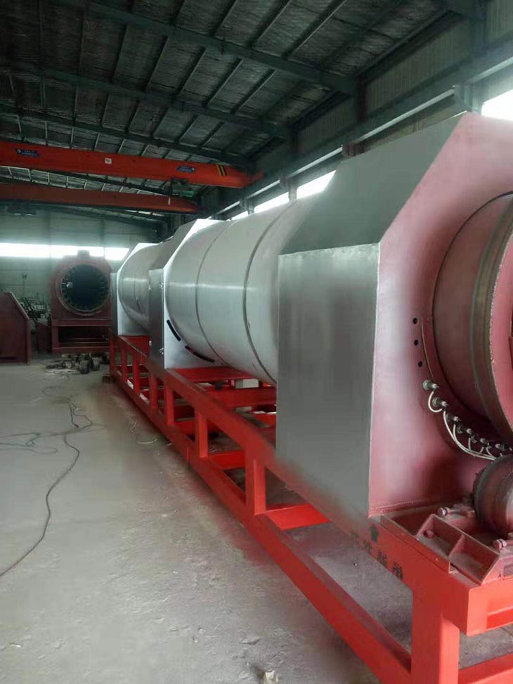我們解決其技術問題所采用的技術方案是:一種新型環保節能熱風炒爐,由電源供電,包括第一燃燒室、第二燃燒室、熱風炒爐滾筒、存料機、自動喂料器、出料機、引風機和排潮風機,所述熱風炒爐滾筒的入口端通過自動喂料器與所述存料斗連通,所述熱風炒爐滾筒的入口端還通過風道與所述排潮風機連通,所述熱風炒爐滾筒的出口端與出料機連通,所述第一燃燒室和第二燃燒室通過風道與引風機連通,所述第一燃燒室和第二燃燒室分別位于所述熱風炒爐滾筒的下方,所述熱風炒爐滾筒軸心線與水平面形成2°到8°的夾角,所述第一燃燒器和第二燃燒器安裝位置在相應燃燒室的前端或者相應燃燒室的兩個側面。我們設備取消了原熱風炒爐所配套的單獨熱風爐、彎段風道或直段風道;在炒爐滾筒下方設計安裝兩份熱風燃燒室,用燃燒器產生的熱風直接對滾筒進行加熱,最大限度地縮減了炒爐散熱環節和面積,從而實現炒爐連段式加熱。與現有設備相比,我們公司設備充分利用了熱風釋放的熱量,減少了熱量損失,單噸油料或糧食加工消耗添人氣甚至能降低到25nm3,降低了17%,節能降耗效果非常明顯,得到了客戶的一致好評。與現有設備相比,同等日加工量,所配兩臺燃燒器合計功率比現有設備燃燒器功率下降20%-30%,熱風設定溫度有750-800℃下降到400-500℃,明顯延長了炒爐的使用壽命。第一燃燒室和第二燃燒室的功能各不相同,工作溫度也不一致,第一燃燒室和第二燃燒室能夠實現分段加熱溫度控制,更加靈活與合理,安全可靠,便于操作與控制。